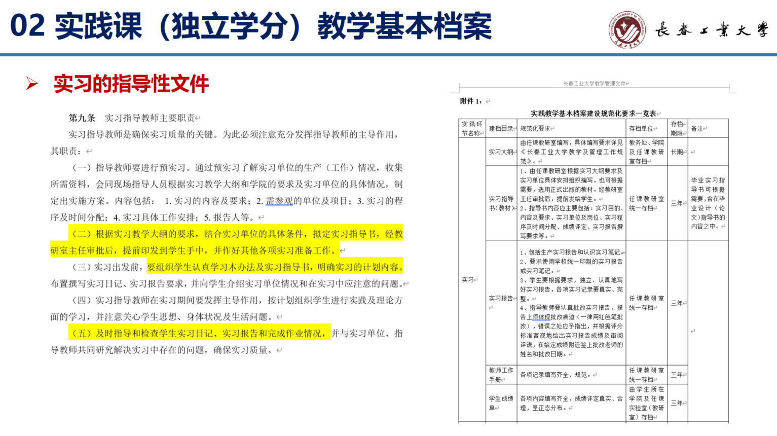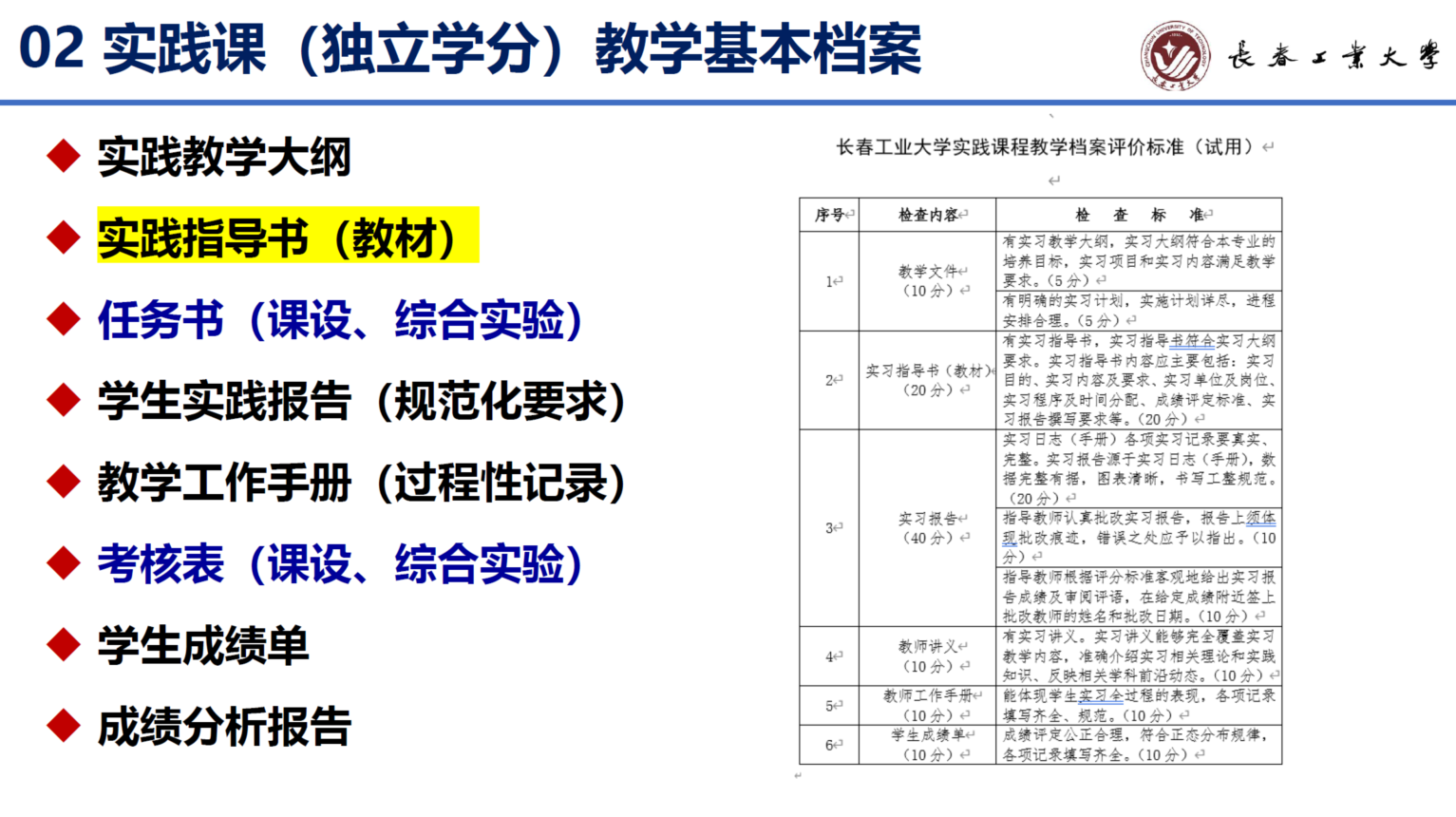 在实践课教学基本档案方面,于教授指出,实践指导书、任务书、学生实践报告、考核表等都是关键部分。她强调,实践教学是培养学生动手能力和创新能力的重要环节,实践教学档案的规范化建设不容忽视。