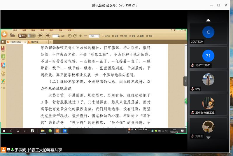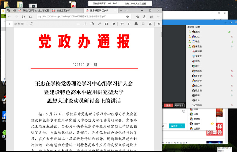 党委组织全体教师专题学习。学习内容有:全国“两会”精神、校党委书记王忠5月27日在学校党委理论学习中心组学习扩大会暨建设特色高水平应用研究型大学思想大讨论动员研讨会上的讲话精神和《特色高水平应用研究型大学建设思想大讨论推进方案》。各党支部以在线集中学习和自主学习等方式对上述内容进行了全面解读,并深入领会内涵实质。