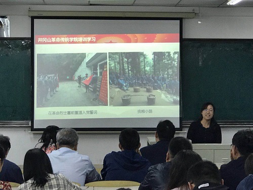 王丽娜为教师党员作了题为“井冈山革命传统精神”的专题讲座。她结合自身曾前往井冈山学习的经验从“井冈山的背景”、“井冈山的斗争”以及“井冈山的精神和红色基因传承”三个方面讲述了井冈山精神为中国革命播撒下燎原火种,是激励全国人民奋勇前进的巨大力量。“坚定执着追理想”、“实事求是闯新路”、“艰苦奋斗攻难关”、“依靠群众求胜利”,王丽娜通过讲述一系列革命先辈的红色故事,带领在座教师党员们了解红色历史、触摸红色历史,加深对井冈山精神实质的理解。