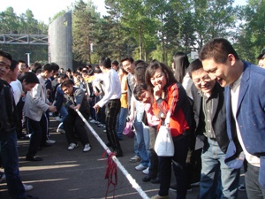 党总支副书记周文军及学生工作办公室全体老师到场为参赛队员加油助威。 伴随尤处长一声哨响,首场拔河比赛在05级11个班级代表队中拉开帷幕。比赛实行淘汰赛和循环赛相结合的赛制,热血澎湃、激情迸发的比赛现场呐喊声、加油声此起彼伏,全体同学都忘我的投入到比赛当中。经过激烈角逐,050301班获得冠军,050302班和050309班分获亚军和季军。   |