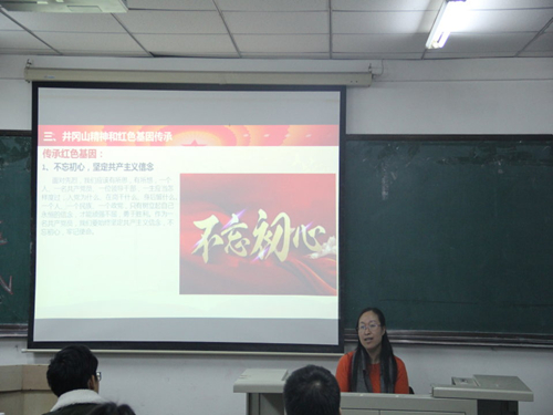 党委书记王丽娜主讲,王丽娜从“关于井冈山”、“井冈山的斗争”、“井冈山精神及革命传承”三个论点展开话题。围绕井冈山精神的内涵、习近平总书记关于井冈山精神的重要论述及当代大学生如何培育和弘扬井冈山精神等方面,并结合国情和校情,对什么是井冈山精神、怎样弘扬井冈山精神进行了深刻阐述。王丽娜对参加党校学习的同学提出两点希望,一是希望同学们加强自主学习,丰富学习内容,创新学习形式,做到真正的学有所成;二是让同学们端正入党的动机,要有实现共产主义远大理想和建设中国特色社会主义的坚定信念。
