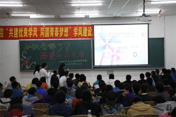 本次比赛共有10支队伍参加,对比赛环节进行了很大程度的创新与改革,采用电视科普节目一站到底的形式进行,三人一队进行一对一PK,输的人换下一名队员继续答题,直到三名队员全部失败,该队输掉比赛。经过初赛,共有4支队伍进入最终的决赛,决赛中观众生动活泼,选手们回答得敏捷快速,现场气氛热烈;最终130302班获得冠军、130301班获得亚军、 130306班获得了季军。 本次比赛进一步普及了历史文化知识,丰富了广大学生的业余文化生活,加强了两校区的交流与沟通。 |