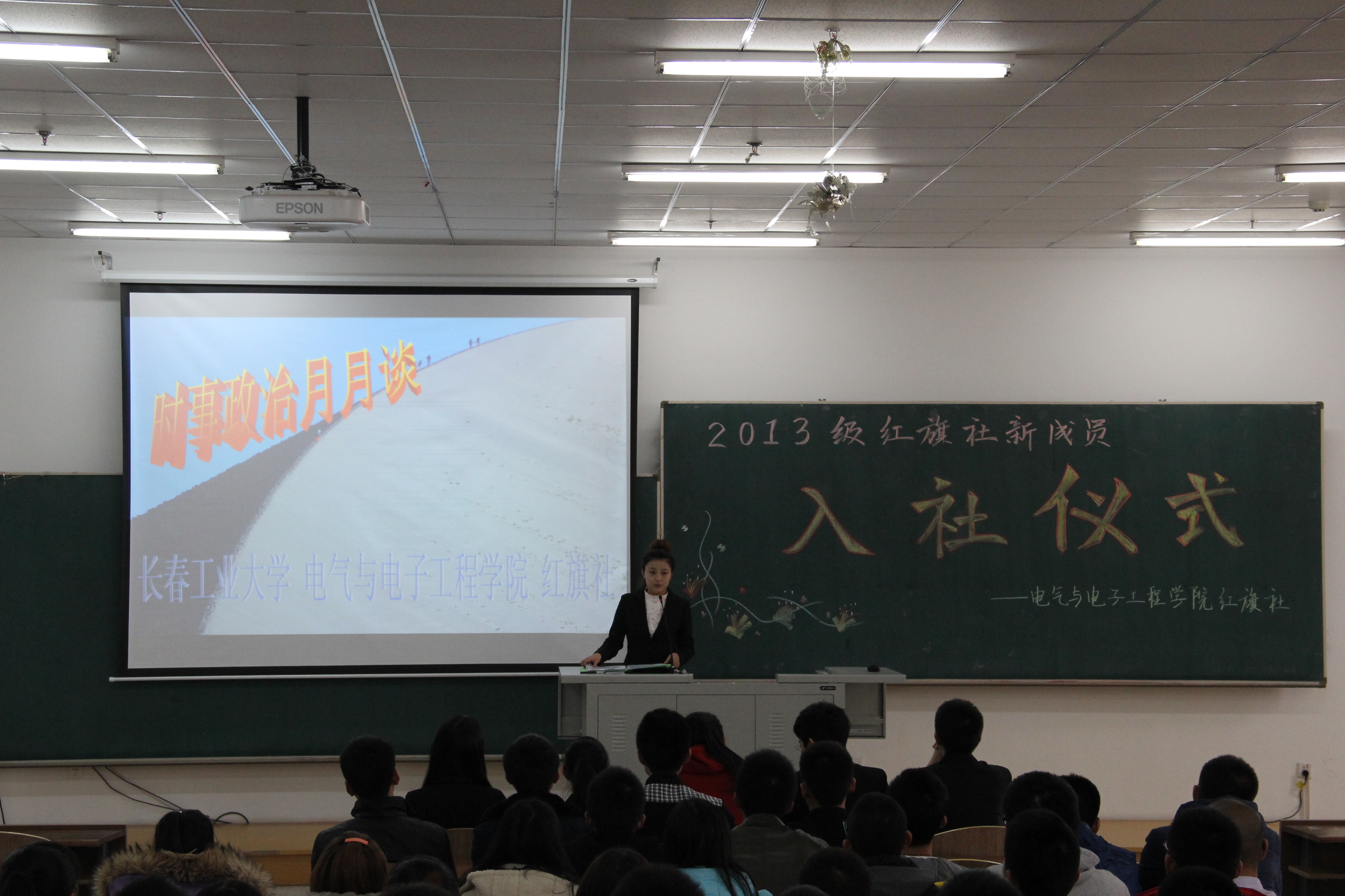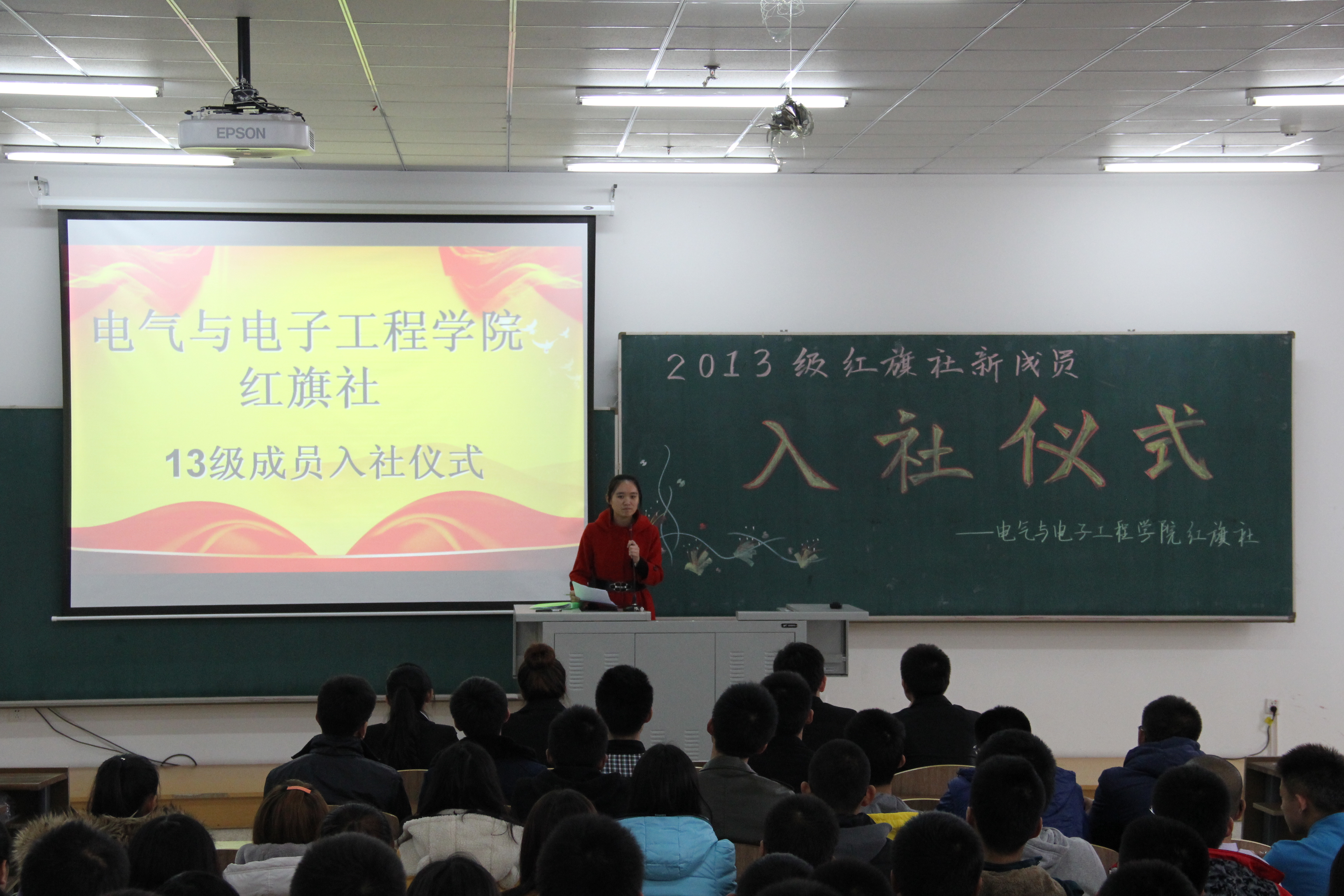 红旗社于北湖校区东阶301教室举行13级新社员入社仪式。出席本次入社仪式的有团委副书记兼红旗社社长夏天竺,副社长李雯茜,陈思潼,邵莘尧及各理论学习部门副部长等。