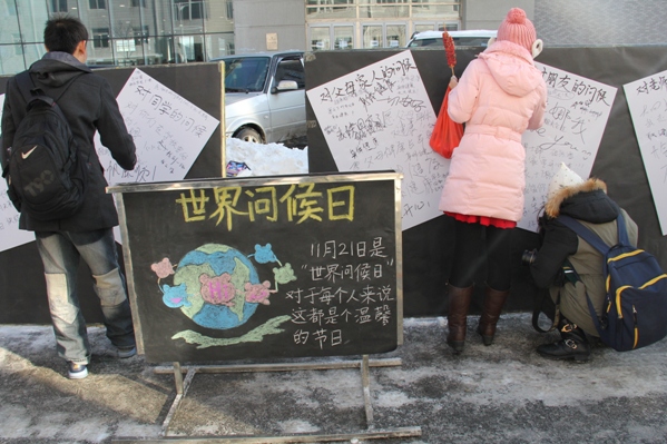 为了让更多的人感受到关爱,活动主要有两环节组成:第一环节是写下对他人的问候,对老师领导的问候、对父母家人的问候、对未来自己的问候等。同学们停止了脚步,纷纷在留言板上留言问候,期间赠送每位写问候的同学一杯热腾腾的豆浆,送上冬日里的一份温暖,现场还有抽奖活动,场面十分火爆。第二环节在南湖公园进行的“say hello”活动,向过往的游园市民友好问候。虽然大家警惕性较高,但还是得到市民们不错的回应。