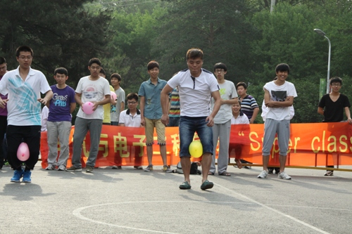 每班8人参赛,膝盖夹气球跳,队员分别站在赛道两边,第一队员用膝盖夹气球跳向赛道另一边,期间若夹爆或者掉落,则需要重头来,到达后将气球交给另一个人,原路返回。比赛精彩激烈,最终110311班获得胜利。