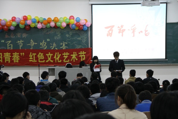 伴随一段优美的舞蹈,百节争鸣活动拉开了序幕。一段歌曲串烧给大家带来了听觉享受,充分体现了青年人的朝气与活力。小品《国庆的保健品》、《国庆集训》、《找家长》分别以国庆节和教师节为主题用诙谐幽默的语言诠释了同学们对这些节日的别样理解。一首悦耳的《明月几时有》勾起了大家对“月有阴晴圆缺”的感慨,同时也表达了120307班同学“千里共婵娟”的祝愿。歌声刚落,笑声又起,一段由120303同学带来的相声表演《清明节》逗得在场同学哈哈大笑。接着,120301班同学带来的情景剧《当烟火绽放的那一刻》为大家献上了一场视觉盛宴,给同学们带来了视觉的冲击!120311班同学带来的诗朗诵《爱你是我一生的荣耀》抒发了真挚的爱国情怀,让同学深埋的爱国热情全都迸发出来!120309班和120303班以“七夕节”为主题的小品《牛郎织女》、《情人节那些事》,另类的诠释了七夕节的由来,风趣的话语和搞怪的表情表演赢得现场阵阵掌声!最后120308班以“母亲节”为主题的手语歌曲《感恩母亲》,表现了母爱的伟大无私。在紧张的成绩核算中,院秘书处带来了串场歌曲《小酒窝》。最终120309班和120310班获得一等奖,120307班、120308班、120311班、120313班获得二等奖,120301班、120302班、120303班获得三等奖。