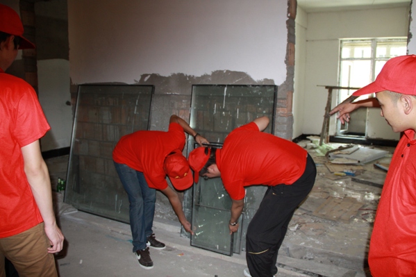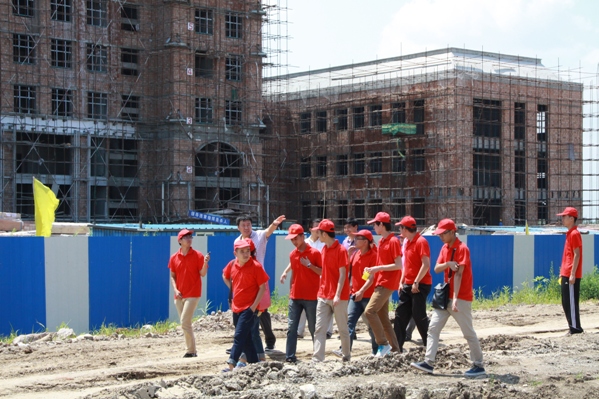 在参观的过程中,建筑工人忙碌的身影随处可见,一边参观赵总工程师一边解答着来自同学们的提问,同学们了解到每座建筑都是经过精细的设计,凸显并张扬新校区与众不同的建筑风格。在参观即将竣工的学生公寓时,同学们帮助室内装修工人力所能及的做些志愿服务工作,为校区建设贡献一份绵薄之力。