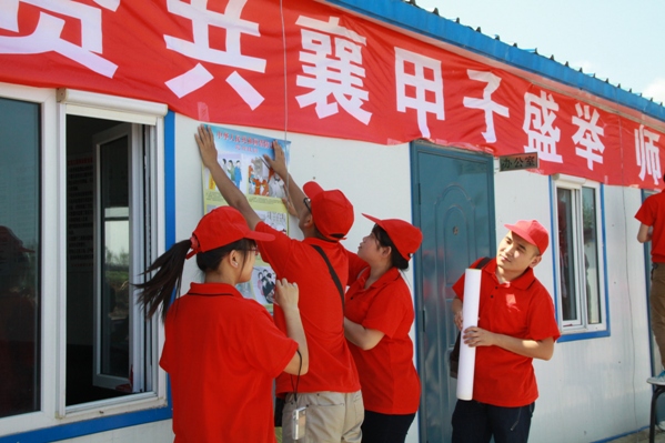 抵达北湖校区后,大学生志愿者便以饱满的热情和高涨的情绪投入到北湖校区的志愿服务当中。考虑到北湖建筑工人的安全,同学将带去的数张防火安全教育宣传图粘贴在他们每天工作的路上,提醒他们注意安全防范。为表达对建筑工人的辛苦付出的感激之情,同学们将鼓励的条幅挂在工地明显处。
