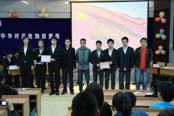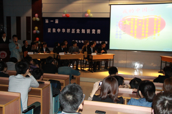 经过初赛的角逐,110302班的铿锵百小生组合,110304班的冬杰傲雪组合,110306班的青春飞扬组合,110309班的101度组合,110311班的潜龙组合脱颖而出。伴随着铿锵有力的乐曲令人期待的“爱我中华杯”历史知识竞赛决赛正式拉开了帷幕。活动中各团队都有不一样的风采,不一样的气势,他们在台上能言善辩,尽显才华,引发了同学们阵阵雷鸣般的掌声。 竞赛分为爱国题目由我答,爱国歌曲由我唱,电影经典我来演,历史经典我来闯。其中爱国歌曲我来唱采用接歌的方式,电影经典我来演由得分第一的组来配音并且从电影中的细节来提问。最后的历史经典我来闯分别有40分,50分,60分的题答对加上相应的分否则扣除相应的分。活动期间还有高博、崔欣等同学带来《爱国不是一句口号》、《只要有你》等幽美歌曲,使现场气氛更加活跃。