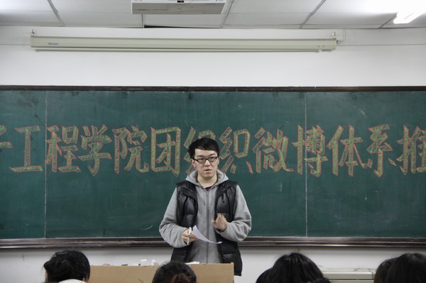 本次会议由院团委副书记徐乐主持。在她的言语中充分体现了此次会议的重要性,并概括的介绍了微博体系的内容与作用。首先微博是面向大家,面向社会的,作为一个优秀的团体,宣扬积极向上的精神是很有必要的;其次,能让大家能通过微博中的只言片语来了解一个集体,那就得不断更新,让最新的动态展现给他人;最后,此账号是不断沿用的,需妥善保管。在座团支部书记初步了解后,杜建讲解如何操作此项活动。通过讲解与说明,支书们了解了组织微博体系的全部内容,并表现出定能出色完成此项任务的信心。