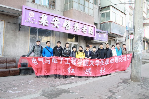 早上九点红旗社的成员们怀着激动地心情带着为老人们准备的水果、生活用品从学校出发,二十分钟后到达目的地。在与老人们聊他们曾经故事的过程中,感受到他们艰苦的人生历程,感受到了社会的变迁,更加了解了党的艰辛历程。此外,还表演了有趣的娱乐节目,为老人们枯燥平淡的生活送去了快乐,并用快乐送去对老人最好的祝福。最后,红旗社的成员们将老人的房屋进行卫生打扫,为老人们创造了一个窗明几净的生活环境。中午十一点多红旗社成员依依不舍的离开了养老院。