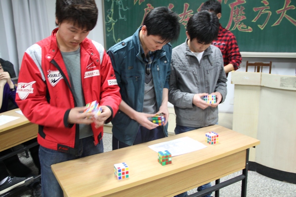 首先由主持人介绍了魔方的起源和特点,并宣布个人赛开始,个人赛共有九人参加,采用计时(三次取最快成绩)的方法进行比赛,比赛一开始,选手们就进入了激烈的角逐,现场的掌声此次彼伏。然后进行了有奖竞答环节,从刚开始主持人介绍的内容中挑选问题,让同学们更加深刻地了解魔方,现场气氛地热烈让嘉宾们也在休息的时段里玩起了魔方。随后进行了团体赛,团体赛以班级为单位,三人一组根据随机抽到的图形进行比赛。最终9号选手和欣雨以36.5秒的成绩夺得个人赛一等奖,团体赛中,100312班夺得一等奖,100311班和100301班获得二等奖,100307班和100304班获得三等奖。