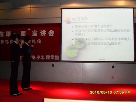 “豆荚”乐队友情演唱为本次宣讲会拉开了序幕。本次宣讲会分两个部分,分别介绍了商务礼仪和面试礼仪,以视频和PPT的形式教会大家在职场社交和求职面试时要注意的事项。其中,商务礼仪方面:就服饰、站姿、坐姿和首饰进行了着重的讲解,并且由两位同学对站姿和坐姿做了具体的展示。面试礼仪方面:讲解了握手、名片、电梯等方面的礼仪。随后为了更加生动形象的展示利益的重要性,由女生部的四位部员为大家演出了一段情景剧《面试》。最后,院十佳歌手徐超为大家亲情献唱一曲《夜曲》。自此,本次宣讲圆满成功!