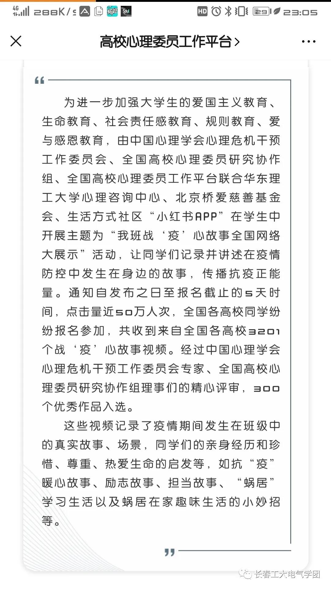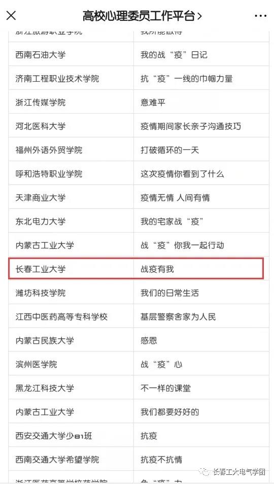 疫情当前,为进一步加强大学生的爱国主义教育、生命教育、社会责任感教育、规则教育、爱与感恩教育,引导广大青年学生弘扬主旋律,传播正能量,由中国心理学会心理危机干预工作委员会、全国高校心理委员研究协作组、全国高校心理委员工作平台主办、华东理工大学心理咨询中心、北京桥爱基金会协办的全国“我班战‘疫’心故事大展示”活动已完美结束。该活动全国点击量近50万人次,各高校同学纷纷报名参加,共收到3201个战“疫”心故事视频。