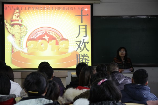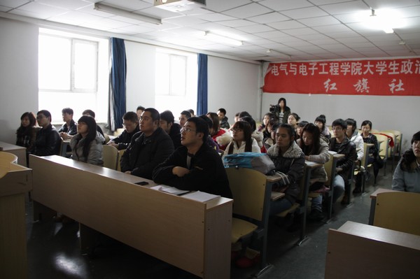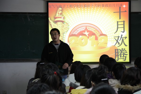 (通讯员 史梦婷)11月12日12:30红旗社于教学主楼1401室展开了时事政治月月谈之十月欢腾的政治思想学习活动。学生党支部书记郑洪斌、团委书记赵爽出席了本次活动。