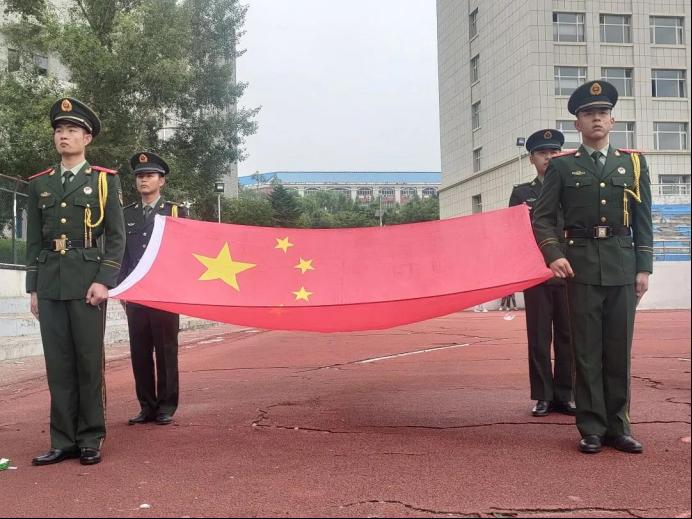 沐浴在清晨的微风中,每个人都精神抖擞。六点五十分,仪式正式开始,国旗护卫队的同学们踏着铿锵的步伐,表情坚毅有力,动作整齐划一,庄严地护卫国旗入场。