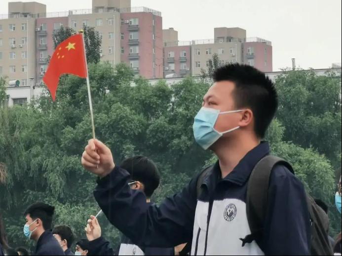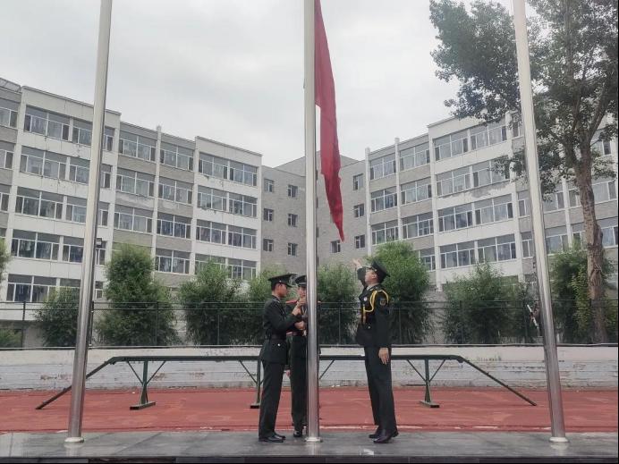 鲜艳的五星红旗迎着朝阳随着国歌缓缓升起,全体师生行注目礼,虔诚的目光中是发自内心的对国旗的热爱和敬意。