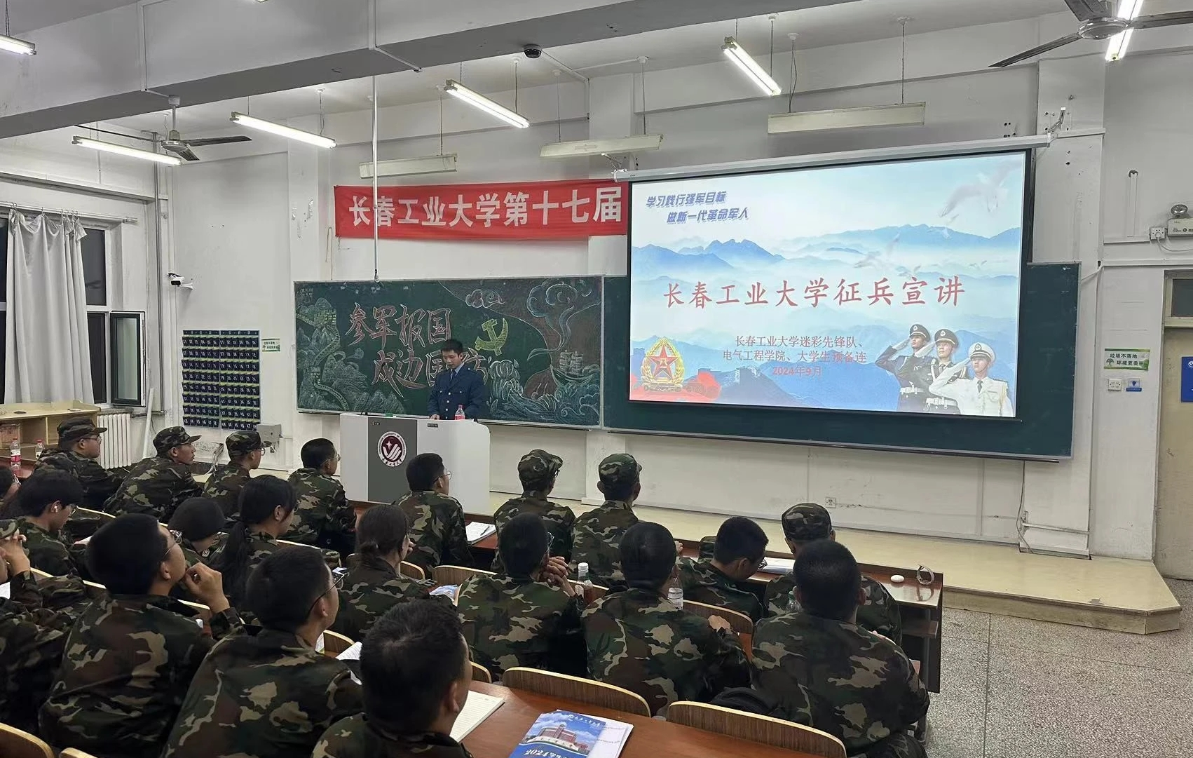 精心策划了这场征兵宣讲会,特别邀请了退伍军人代表,为大一新生们带来了一场内容丰富、意义深远的国防教育活动。通过政策解读、经验分享和互动问答,宣讲会旨在帮助新生了解国家的征兵政策,感受军营生活的魅力,激发他们的爱国情怀和报效国家的意愿。