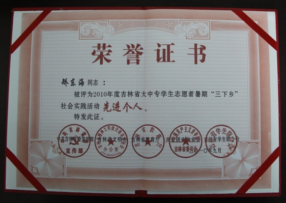 团委书记矫东海获得2010年吉林省大中专学生志愿者暑期“三下乡”社会实践活动先进个人。