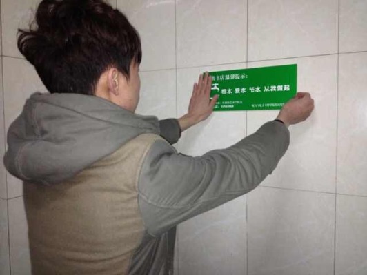 团委的要求,班级同学亲自绘制了有关节能减排方面的原创海报,学生会收集作品并统一展览,提醒同学们多注意身边的小事,每个人都加入到厉行节约、反对浪费的行列中来。 系列活动四:宿舍站——一举之为,和谐工大 党员先锋队志愿者们深入各个教室、宿舍,真实、具体地了解资源利用的情况。志愿者将节水节电小贴士粘贴到教室、洗漱间,号召更多的同学在用水的时候早一分钟把水阀拧紧。