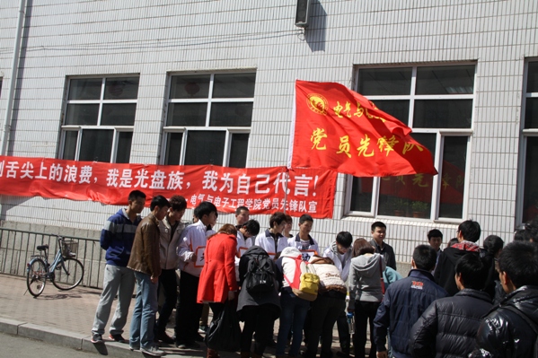 系列活动一:食堂站——光盘行动,从我做起 活动中午,在食堂门口发放“光盘行动”倡议书并向前来就餐同学填写调查问卷,宣传“光盘”行动,并走进食堂,走近同学,劝导同学饮食“少打勤加”。