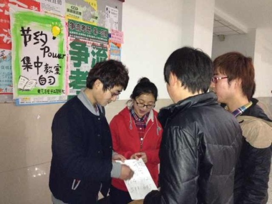 系列活动二:教室站——少用一个教室,多留几度光明 学生会宣传部的志愿者在教学科研楼一楼大厅处设立宣传海报,写明今天开放的自习教室,向大家宣传集中自习的意义和重要性,提倡节能减排,并告诉来自习的同学,希望他们能集中到开放的教室自习学习。