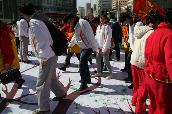 虽然是风力达到5级—6级的大风天,13时filmjav 党员先锋队就到达现场,本次活动是春城首次以绿色为主题的创意活动,党员先锋队的志愿者们和社会团体千余名参加者纷纷在画布上留下了“绿色环保脚印”,呼吁更多人爱护环境,为环境保护贡献力量。新文化报、长春电视台对本次活动给予了报道。