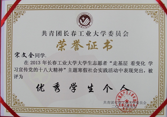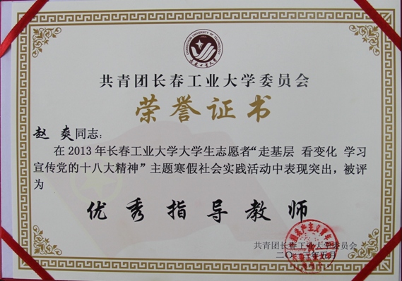 我院赴吉林市金珠豫园社会主义新农村调查小分队获得社会实践活动优秀团队,郑洪斌、赵爽获得优秀指导教师称号,冯畅、宋文全、王丹敏、杨蕊嘉、于婉东获得优秀学生个人称号。