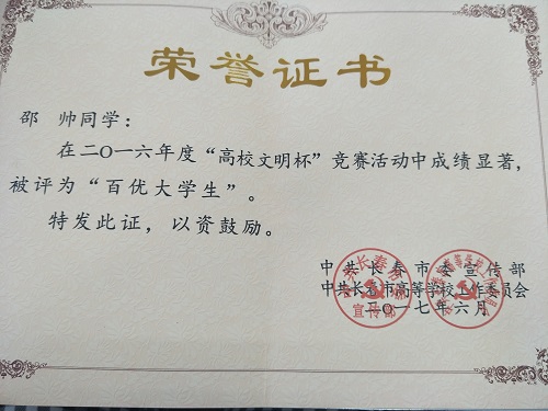 我院邵帅同学在二〇一六年度“高校文明杯”竞赛活动中被评为“百优大学生”