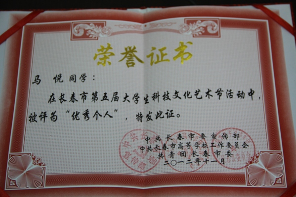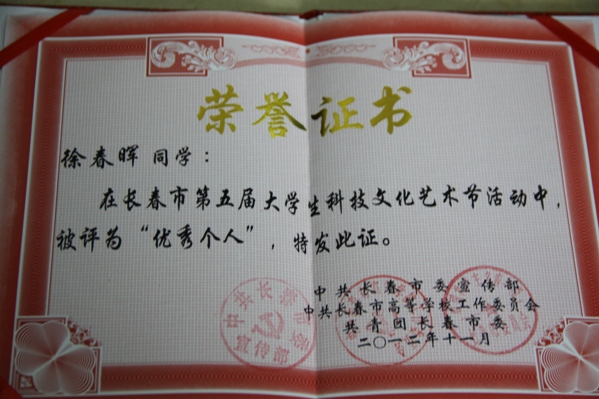马悦、徐春晖获长春市第五届大学生科技文化艺术节优秀个人<