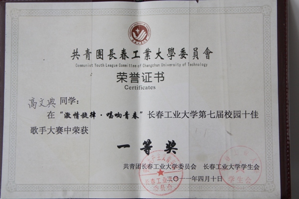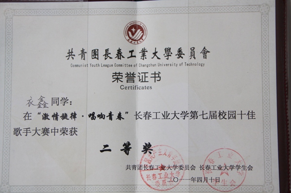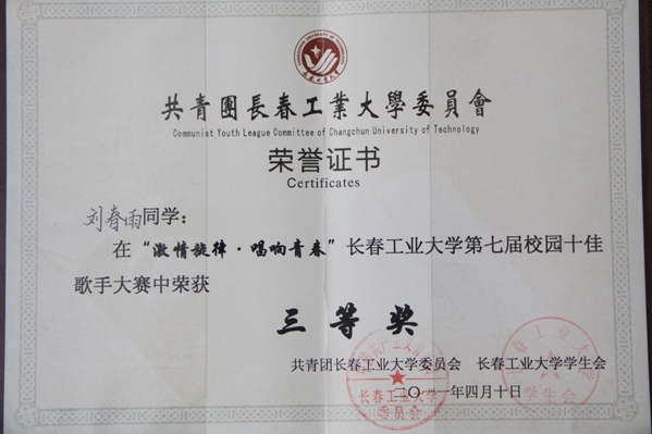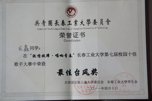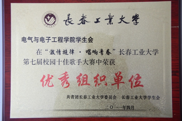 第七届校园十佳歌手大赛决赛中分别获得一、二、三等奖,衣鑫并获得最佳台风奖,我院获得优秀组织单位。