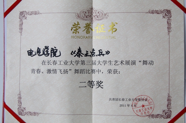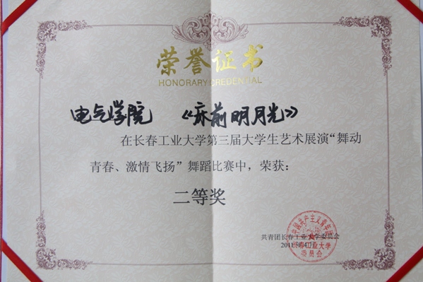 第三届大学生艺术展演系列活动之“舞动青春•激情飞扬”舞蹈比赛中获得二等奖。
