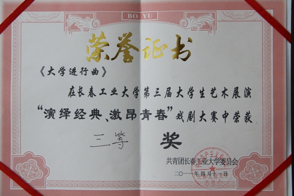 第三届大学生艺术展演系列活动之“演艺经典•激昂青春”戏剧大赛决赛三等奖、优秀奖。