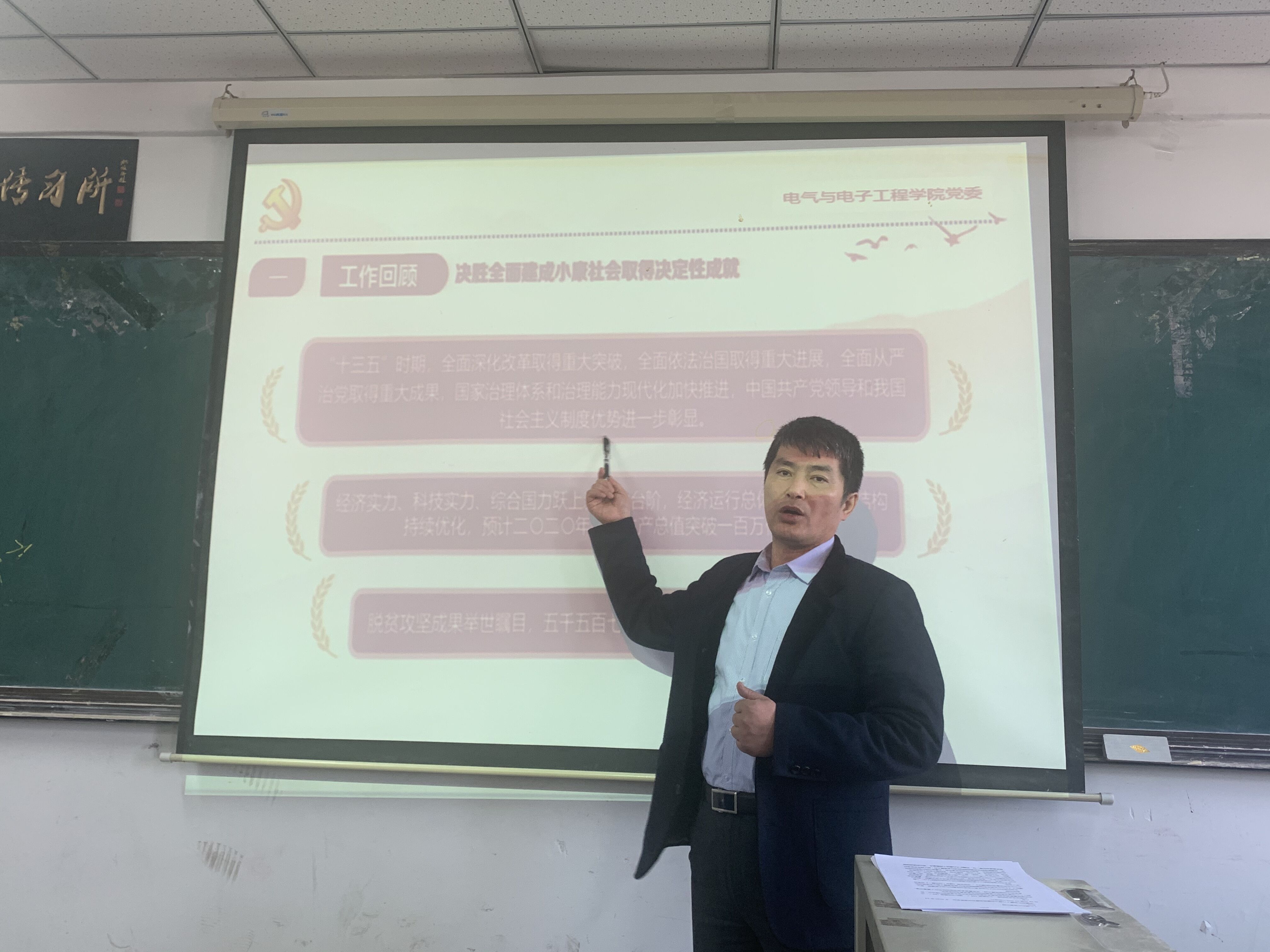 杨景伟同志全面解读了党的十九届五中全会精神,回顾决胜全面建成小康社会取得决定性成就;我国发展环境面临的深刻复杂变化;到二0三五年基本实现社会主义现代化;“十四五”时期经济社会指导思想和必须遵循的原则;“十四五”时期经济社会发展主要目标;全会提出12项重要举措等六项内容。推动教职员工深入理解、准确把握、贯彻落实全会精神。同时要求所有教职员工要把学习贯彻全会精神同推动当前工作紧密结合,继续抓好教学科研、招生就业、博士点申请、一流学科建设等工作。
