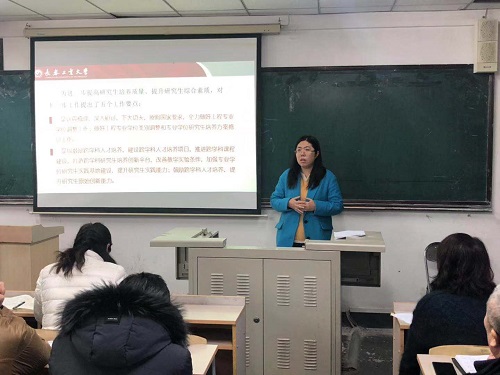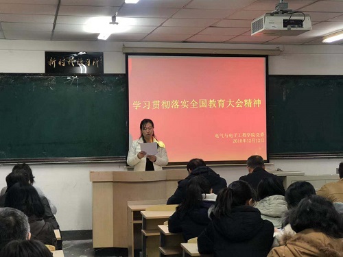王丽娜首先传达了习近平总书记在全国教育大会上的重要讲话精神和学校召开的“学习贯彻落实全国教育大会精神”大会上校党委书记万春明、校长张会轩的讲话精神。