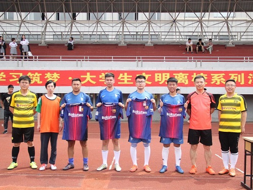 足球运动发展做出巨大贡献的2018届毕业生球将颁发球衣,双方相互握手拥抱并向彼此致以对未来的美好祝福。
