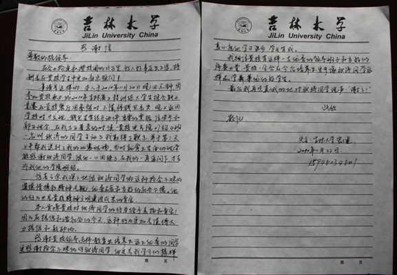 班级。 惊喜之余我深深的被张涛同学的这种拾金不昧的道德情操和精神风貌,优秀品质的良好的社会道德。他的行为也是贵校精神文明建设成果的肯定。 本人恳请贵校对张涛同学的行为给予表扬和肯定!因为在提倡和谐社会的今天,这种行为更加是值得大力提倡和鼓励的。 感谢贵校领导、老师教育处培养出这么优秀的同学,更感谢拾金不昧的张涛同学。他是我学习的榜样,衷心祝他学习进步、学业有成。 我相信贵校有这样一支优秀的领导班子和良好的师资力量,贵校一定会在今后培养出更多像张涛同学这样品学兼优的好学生。 最后我再次真诚的对张涛同学说声:“谢谢!” 此致 敬礼 失主:吉林大学宫健 2010年11月22日