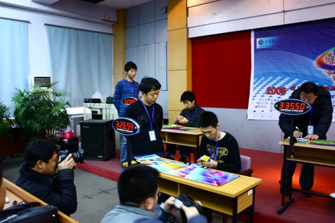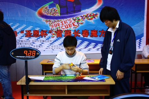 党总支副书记周文军及学生工作办公室各位老师出席了本次活动。 这次长春公开赛是即北京、上海、广州之后我国第四次地域性的大型公开赛。参加本次比赛的有来自吉林、黑龙江、辽宁和内蒙古四个省份的47名高手。这些选手中年龄最小的是15岁的初中生,年龄最大的是35岁的教师。和选手一同到来的还有许多亲友团和慕名而来的观众。本次大赛共有Square-1、二阶速拧、三阶速拧、四阶速拧、三阶单手速拧五大项目。上午9点半,公开赛拉开帷幕,打乱区、裁判区等工作人员各就各位,比赛如火如荼的进行起来。魔方在各选手灵活的手指间飞快旋转,每当有选手突破记录都会引起观众和亲友团的欢呼和鼓掌,场面热烈而火爆!比赛期间,大赛的组委会还特意为观众们准备了表演,飞碟杯和魔块、魔球、魔板、XQ魔方等各种异型魔方飘逸地旋转在高手们的手中,简直成为了一个个具有魔力的精灵,引起了现场一片片欢呼声,所有的观众几乎都站了起来,把现场气氛推到了高潮!在下午的三阶速拧半决赛中,一个来自本省的选手复原的时间达到了17.24秒,与世界记录只差了2.10秒,当时他的母亲激动的上前去拥抱了他的儿子,那一刻牵动了所有在场人的心!最后经过了初赛、复赛、半决赛、决赛多轮的角逐,我校张显吉和吉林大学王思宇等多名选手获得了各个项目的冠军。下午4点半,与会的领导为获奖者颁发了证书和奖品,历时7个小时的比赛圆满的落下了帷幕。 魔方是匈牙利建筑学教授和雕塑家厄尔诺鲁比克于1974年发明的,上世纪八十年代传入中国。玩魔方是一项能增强空间想象能力的传统的智力游戏,包括极具刺激性和竞技性的速拧,单拧,盲拧等玩法。如今魔方文化在欧洲各国家已经十分盛行,而在中国,还仍处在一个初步发展的阶段。这次公开赛的成功举办使所有到场的人们深深的意识到魔方不仅仅是开发智力的玩具,它已日渐成为一种学术性的文化,并且在中国,也有肥沃的发展土壤和广阔的发展空间。我们也能有专业的选手和职业的比赛!此次公开赛在我校的成功举办,丰富了我校大学生的校园文化生活,也为构建我校多元社团文化做出了积极的贡献。