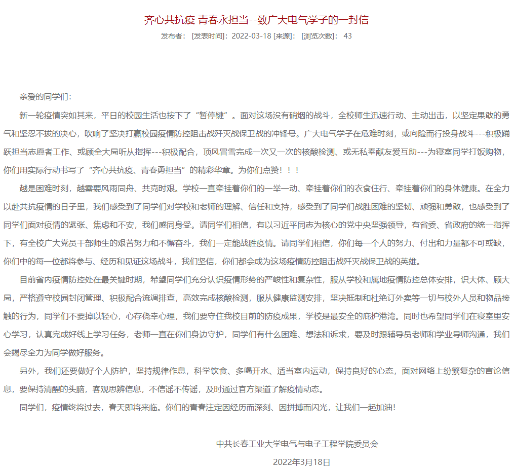 党委赞扬广大电气学子在疫情危难时刻,向险而行投身战斗,积极踊跃担当志愿者工作,所有师生听从指挥--积极配合,顶风冒雪完成一次又一次的核酸检测,用实际行动书写了“齐心共抗疫、青春勇担当”的精彩华章。希望同学们在省内疫情防控的关键时期,服从学校和属地疫情防控总体安排,严格遵守校园封闭管理、积极配合流调排查,高效完成核酸检测,服从健康监测安排,坚决抵制和杜绝订外卖等一切与校外人员和物品接触的行为,同学们不要掉以轻心,心存侥幸心理,我们要守住我校目前的防疫成果,学校是最安全的庇护港湾。提醒同学们做好防护,坚持规律作息,科学饮食、多喝开水、适当室内运动,保持良好的心态,不信谣不传谣。