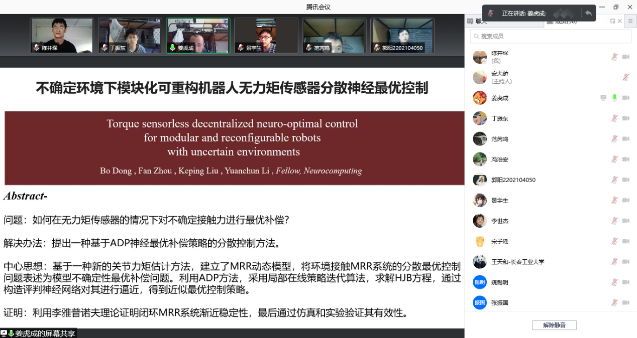 之后由课题组两名研究生作文献阅读报告。首先是研究生姜虎成讲解“不确定环境下模块化机器人无力矩传感器分散神经最优控制”的期刊论文内容,解释文章中可重构机器人在无力矩传感器的情况下运用谐波传动装置对关节力矩进行了估计,建立基于关节力矩反馈的动力学模型,将最优控制问题表述为最优补偿问题,通过评判神经网络和局部策略迭代算法逼近最优控制律,实现了在无力矩传感器的情况下对不确定接触力的最优补偿。